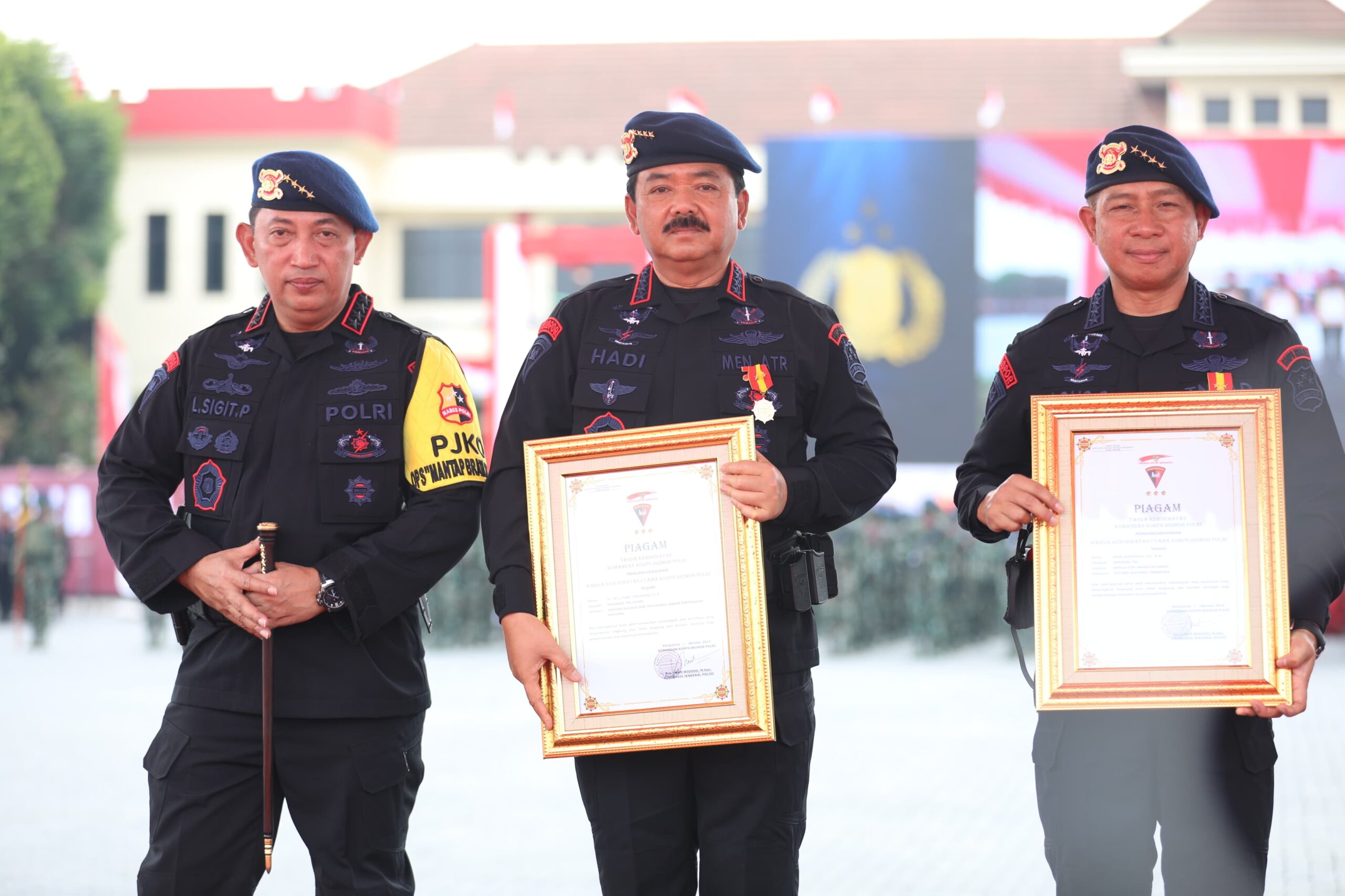 HukumID.co.id, Depok – Menteri Agraria dan Tata Ruang/Kepala Badan Pertanahan Nasional (ATR/BPN), Hadi Tjahjanto menerima penganugerahan sebagai Warga Kehormatan Utama Korps Brimob Polri dalam acara Hari Ulang Tahun (HUT) ke-78 Korps Brimob Polri. Kegiatan tersebut diselenggarakan di Lapangan Mako Korps Brimob Polri, Depok, pada Kamis (16/11/2023).